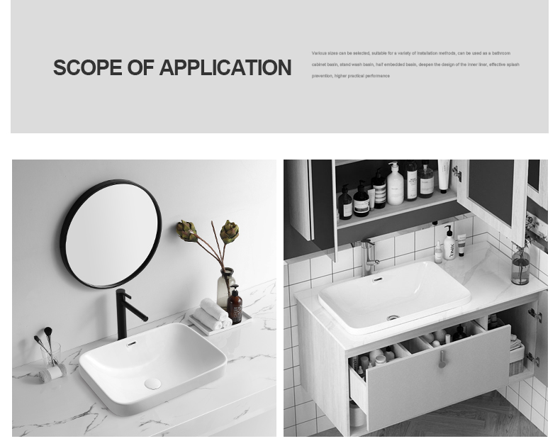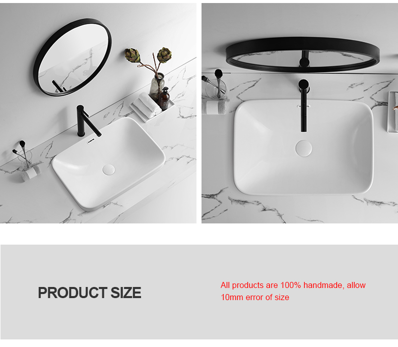 Rounded rectangular semi-recessed washbasin, installed a little higher than the tabletop to prevent water from splashing outside the washbasin.